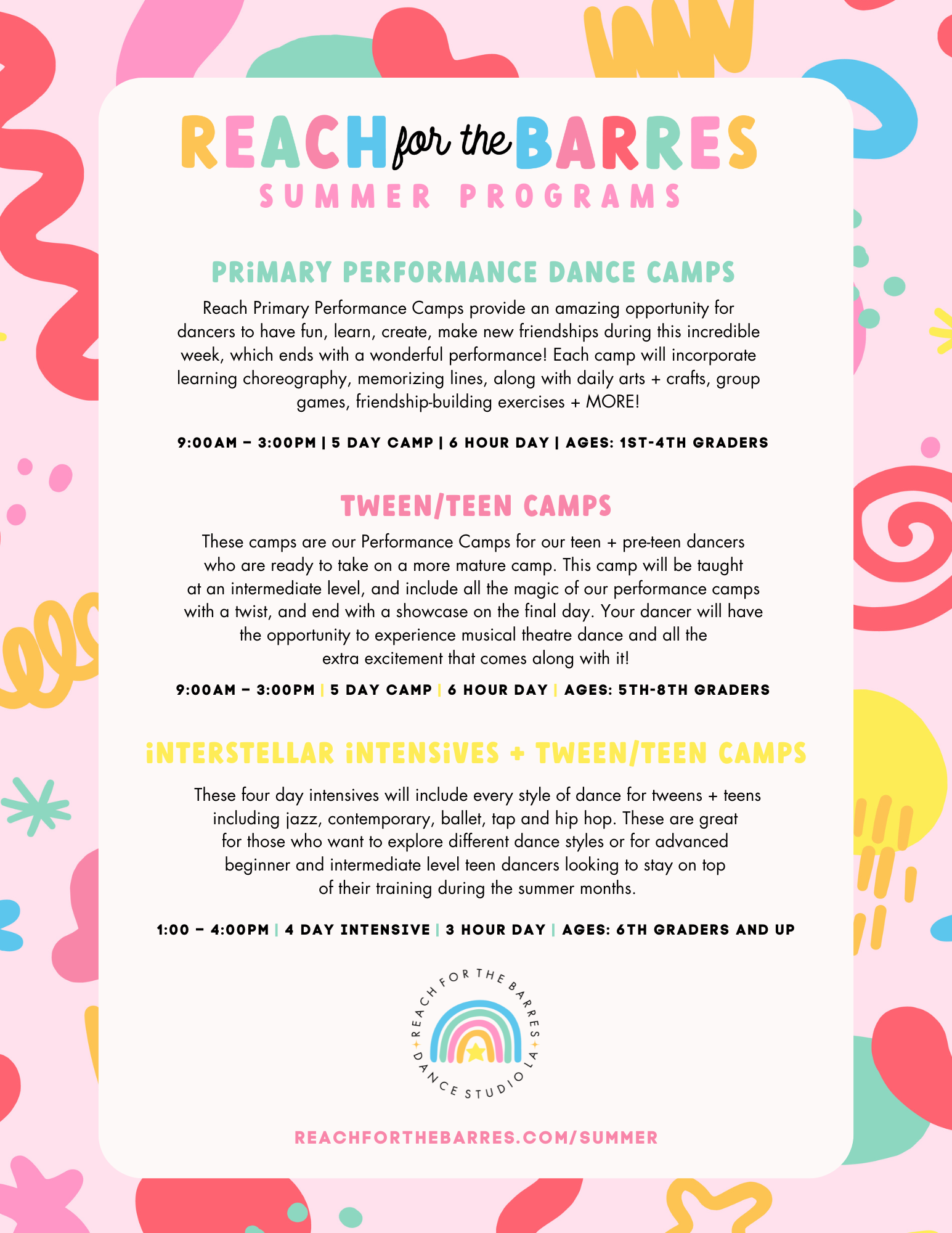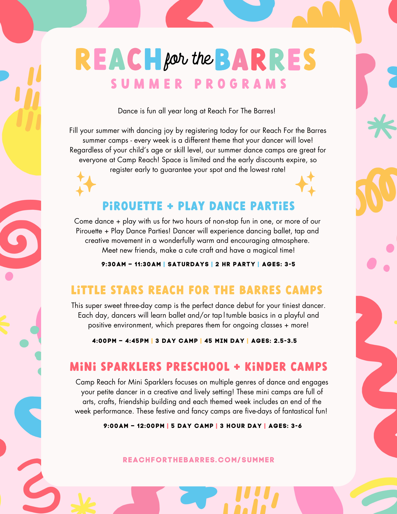 Summer at Reach For The Barres is one of our favorite seasons is full of creativity, confidence-building, and connection. While enrollment isn’t open just yet, we wanted to share a heads up so families can plan ahead and mark their calendars.